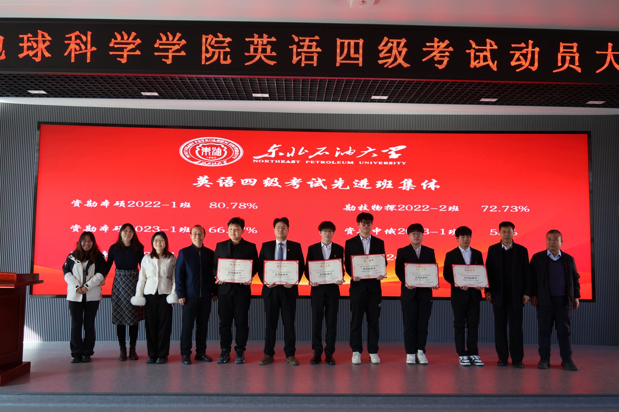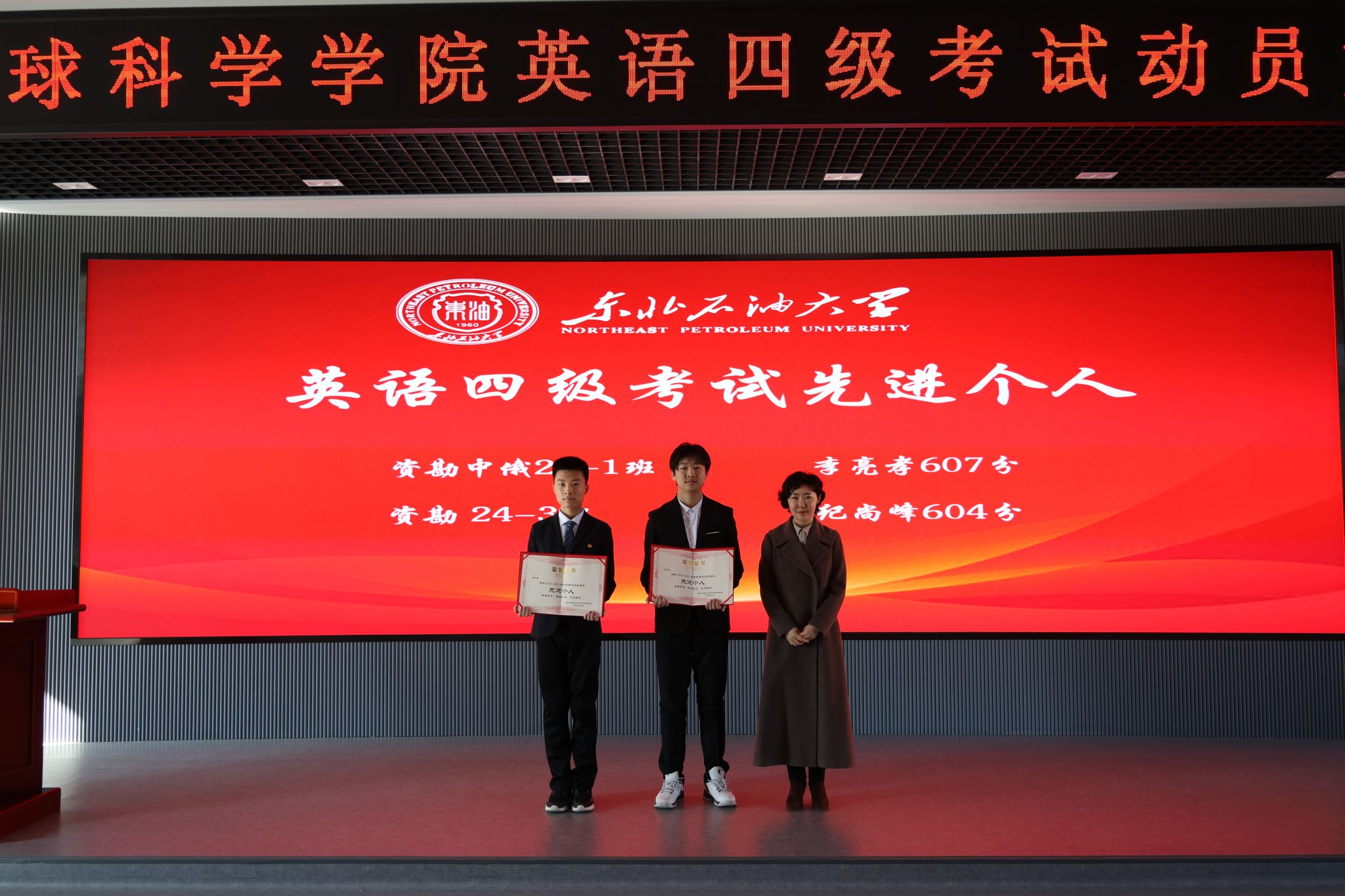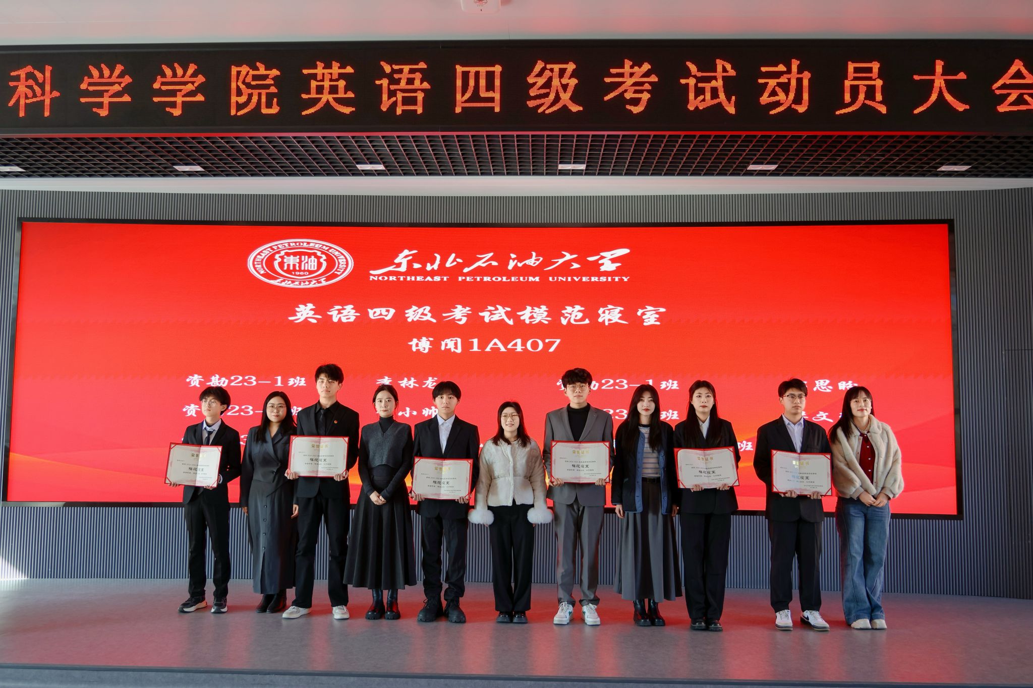 会上,公司表彰了在过往英语四级考试中涌现出的一批成绩优异的个人、学风优良的班级和互助共进的宿舍集体。激励更多同学以榜样为帆,在知识海洋中破浪前行。公司党委书记韦丹宁、获奖班级班主任、辅导员分别为英语四级考试先进个人代表、先进班集体代表、模范寝室代表颁发荣誉证书。