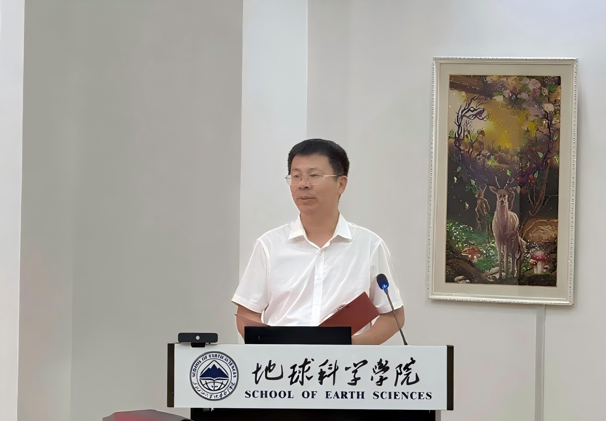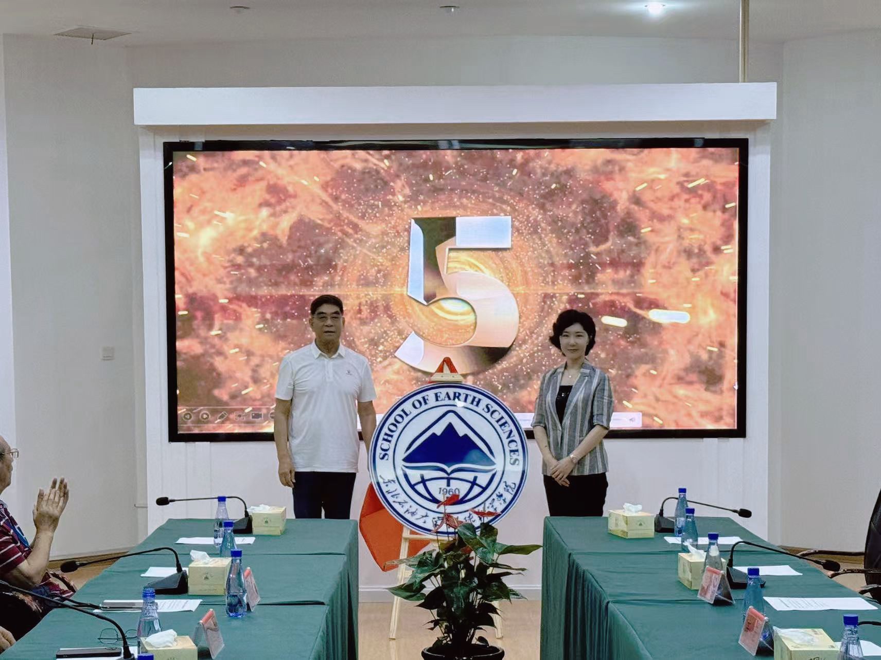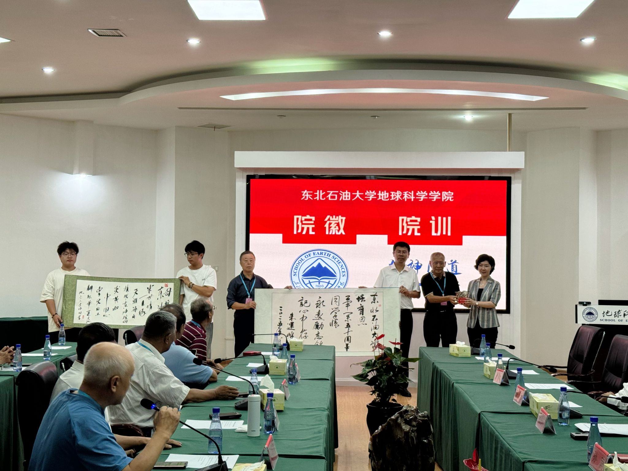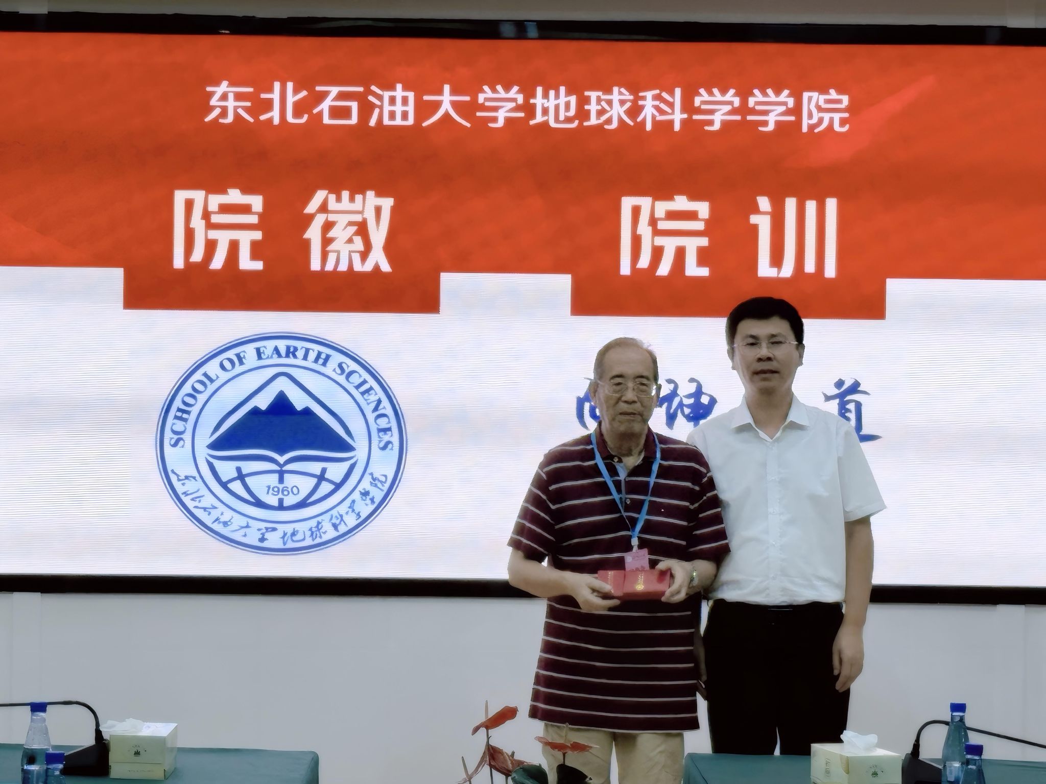 在与会人员的热烈期待中,优秀员工代表、中石化原董事长傅成玉与院党委书记韦丹宁共同为院徽揭幕。伴随着倒计时声,红色幕布徐徐揭开,院徽正式亮相。其融合油滴、山峰、书本、经纬线及“1960”等核心元素,象征公司在地地球科学领域的探索精神和学术使命,现场反响热烈。
