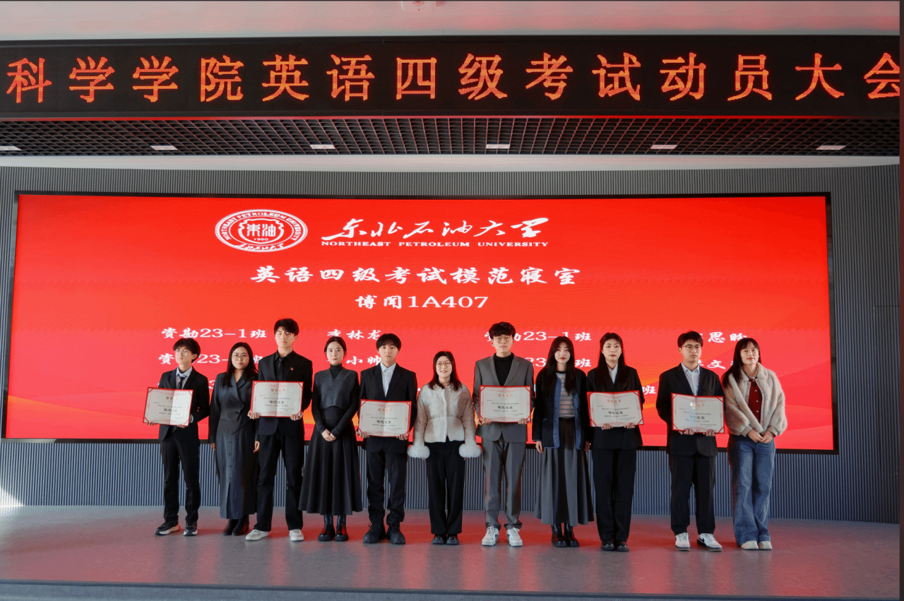 会上,公司表彰了在过往英语四级考试中涌现出的一批成绩优异的个人、学风优良的班级和互助共进的宿舍集体。激励更多同学以榜样为帆,在知识海洋中破浪前行。公司党委书记韦丹宁、获奖班级班主任、辅导员分别为英语四级考试先进个人代表、先进班集体代表、模范寝室代表颁发荣誉证书。